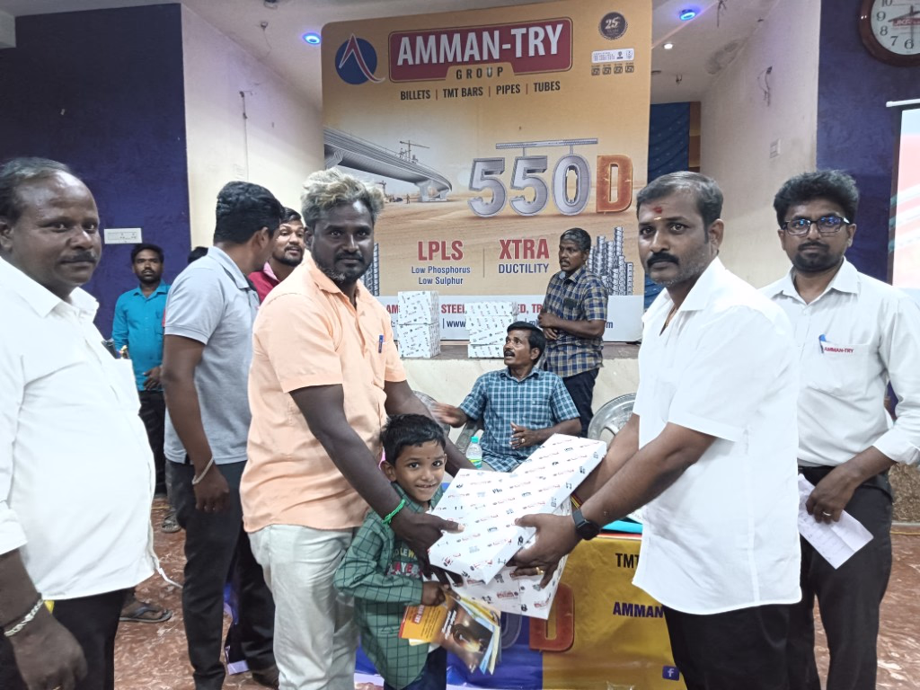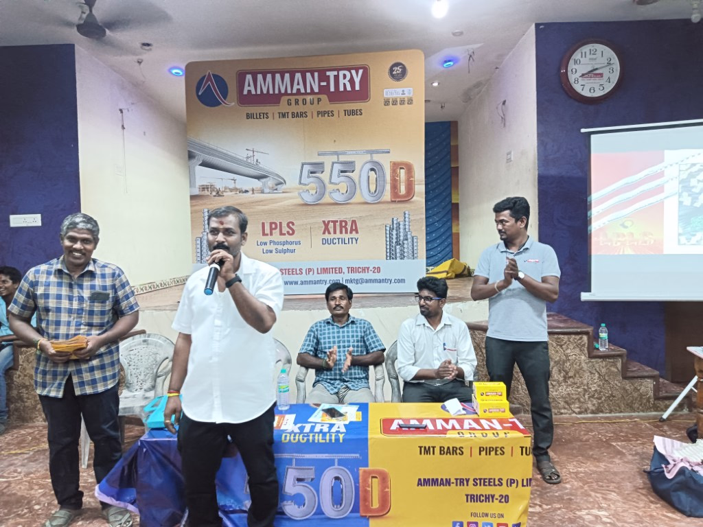 On July 9, 2025, AMMAN-TRY collaborated with Thirumalai Steels and Thirupathi Traders to conduct Bar Bender Meets at Appu Mahal, engaging a total of 200 bar benders from Veppur and Kongarayapalayam.