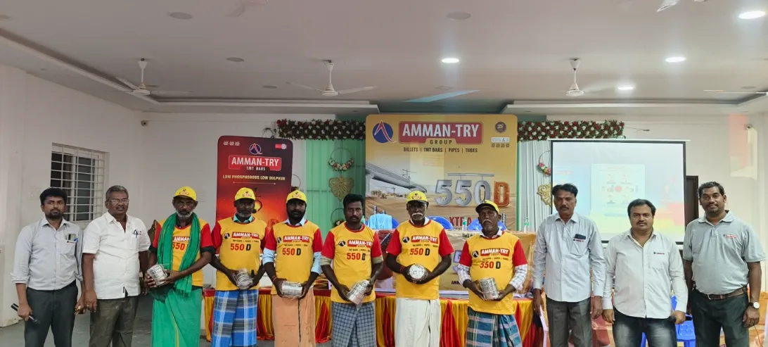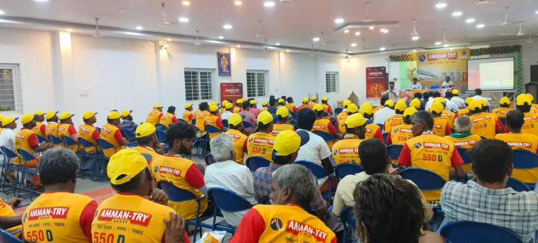 SR Steels conducted a large meet at Amman Thirumana Mandapam, Vedasandur on July 4, 2025, with 150 bar benders. The session focused on brand trust, durability, and safety standards of AMMAN-TRY TMT bars.