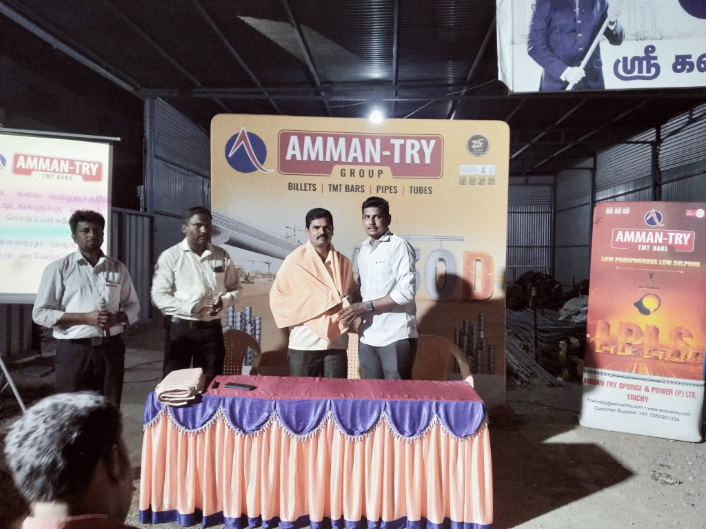 Sri Kavithalaya Steels organized a session at Viraganur on July 1, 2025. 40 bar benders attended and were briefed on AMMAN-TRY’s product strengths, CRS variants, and ready-made rings availability. Gifts and dinner were provided to all attendees.
