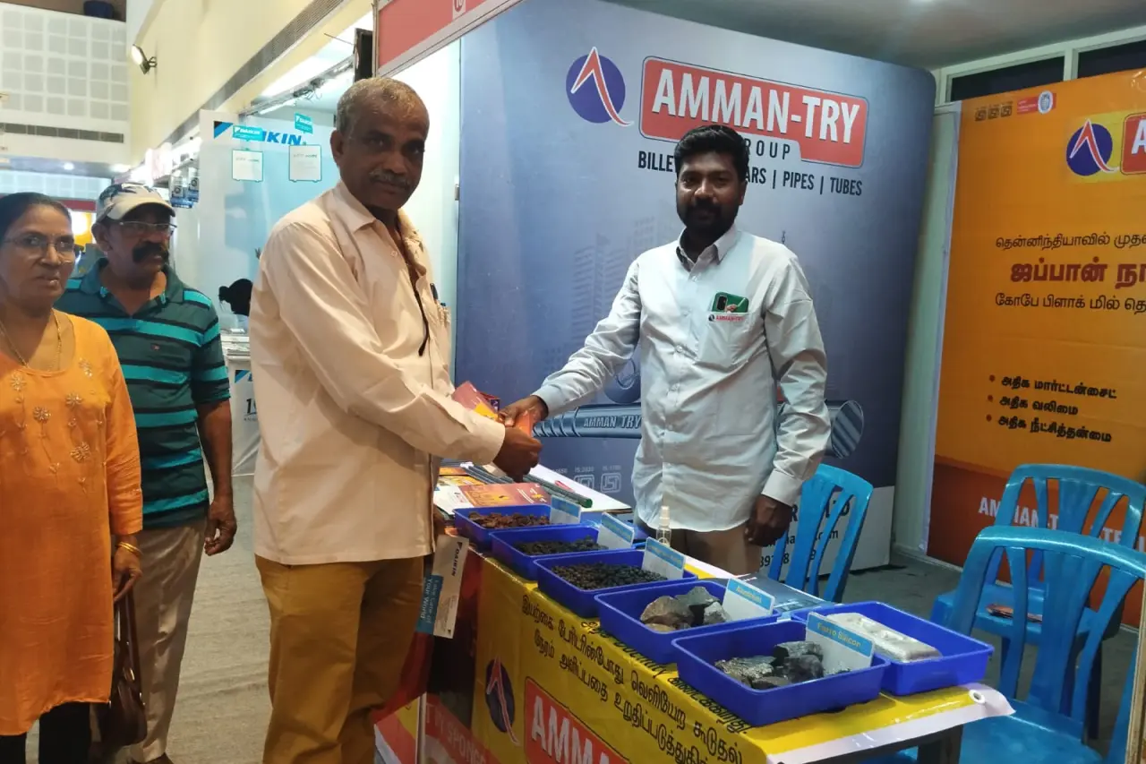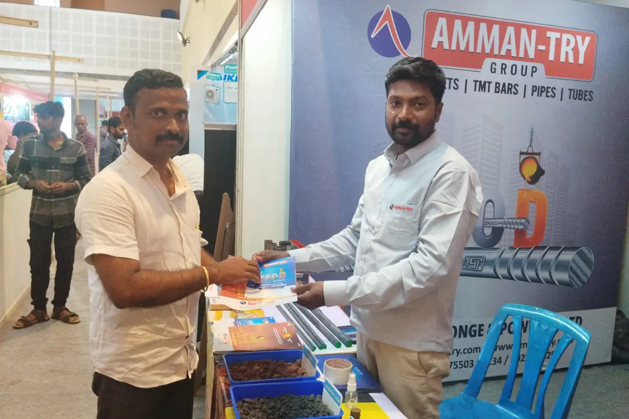 19-07-2024 to 21-07-2024 – At Perumal Kalyana Mandapam, Nagercoil, AMMAN-TRY participated in the ‘Construction Material Exhibition’ organized by civil engineers. Participants were educated about the raw materials used in AMMAN-TRY TMT bars, the manufacturing process, the features of 550 D-grade steel made using the LPLS process, and the pipes and tubes used in structures. Gifts such as pens, keychains, brochures, and catalogues were distributed to attendees.