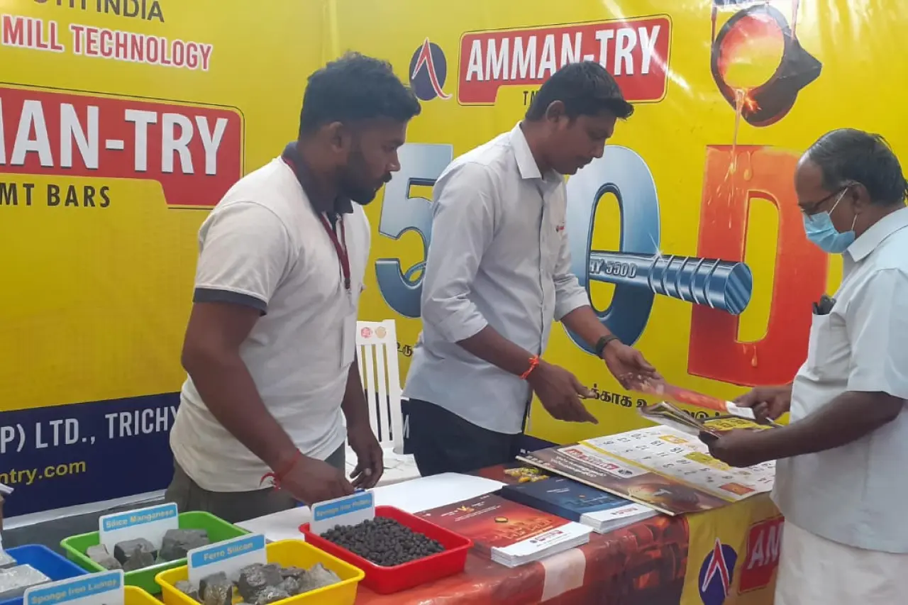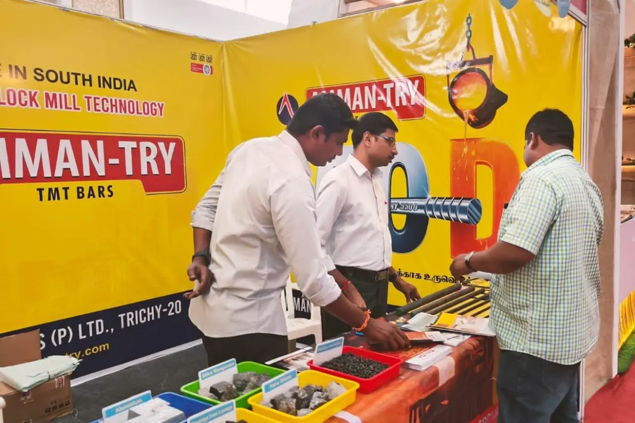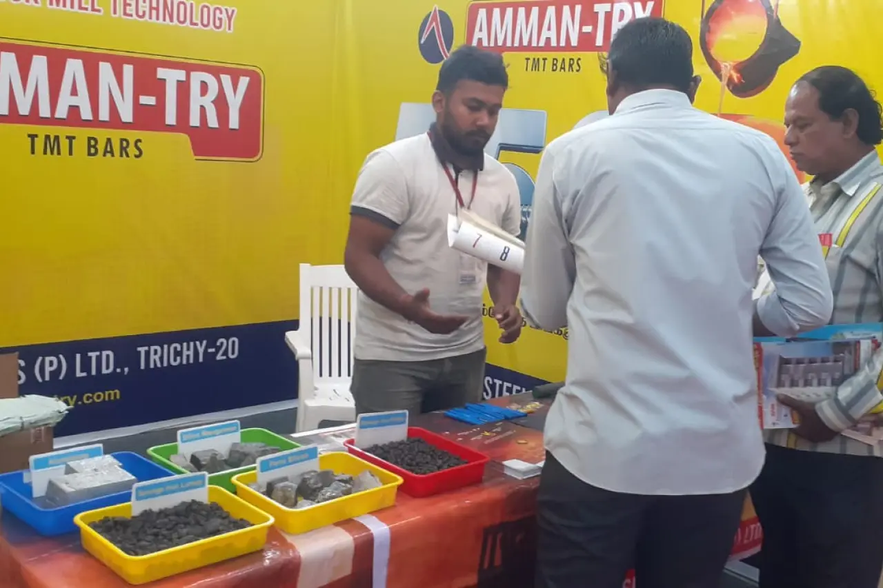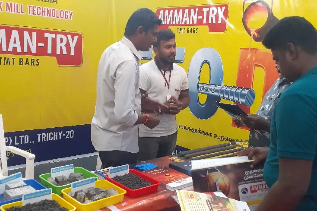 From 5th to 8th January 2024, to make builders aware of construction materials and to create awareness of quality constructions, the Civil Engineers Association is conducting the “Construction Materials Exhibition” regularly across Tamil Nadu. AMMAN-TRY is continuously participating in this event. During the Build Expo – Salem (05-01-2024 to 08-01-2024), our Sales Team provided a detailed explanation to all participants about the raw materials used in TMT bars, the method of making TMT, and the features of LPLS 550 D TMT. Visitors were also given a pen, keychain, brochure, and catalogue as part of the event.