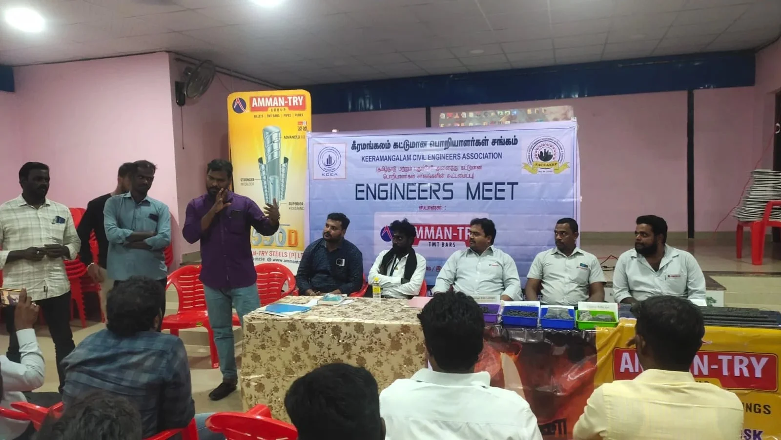 Engineer meetings are being conducted across various districts, in which AMMAN-TRY actively participates to share insights on current construction technologies. During these meetings, detailed explanations are provided on the raw materials used in AMMAN-TRY TMT bars, the manufacturing process of the bars, the key features of 550D bars produced using the LPLS method, and the Pipes & Tubes used in structural applications.